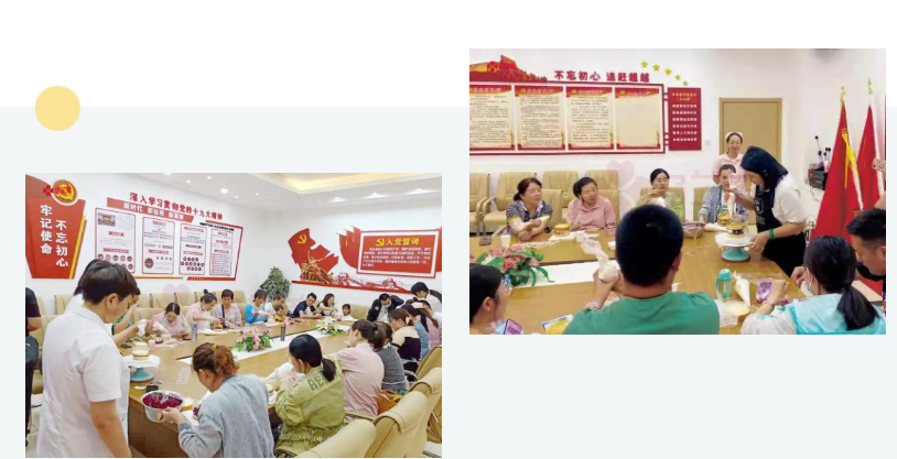 在烘焙師的指導(dǎo)下,大家認(rèn)真學(xué)習(xí)制作蛋糕的技巧——摩拳擦掌,打奶油;躍躍欲試,搓餅干;專(zhuān)心致志,做花邊。大家紛紛自己動(dòng)手,用打蛋器打出純滑扎實(shí)的奶油,裹在蛋糕胚上,涂抹轉(zhuǎn)刮,將切成塊的各種水果一層層疊加,隨后點(diǎn)綴鮮花,一個(gè)個(gè)色彩斑斕的蛋糕映入眼簾。不少準(zhǔn)媽媽們將愛(ài)國(guó)主題元素融入到蛋糕中,既體驗(yàn)到了制作蛋糕的快樂(lè)。又激發(fā)身邊人愛(ài)黨、愛(ài)國(guó)的情懷!